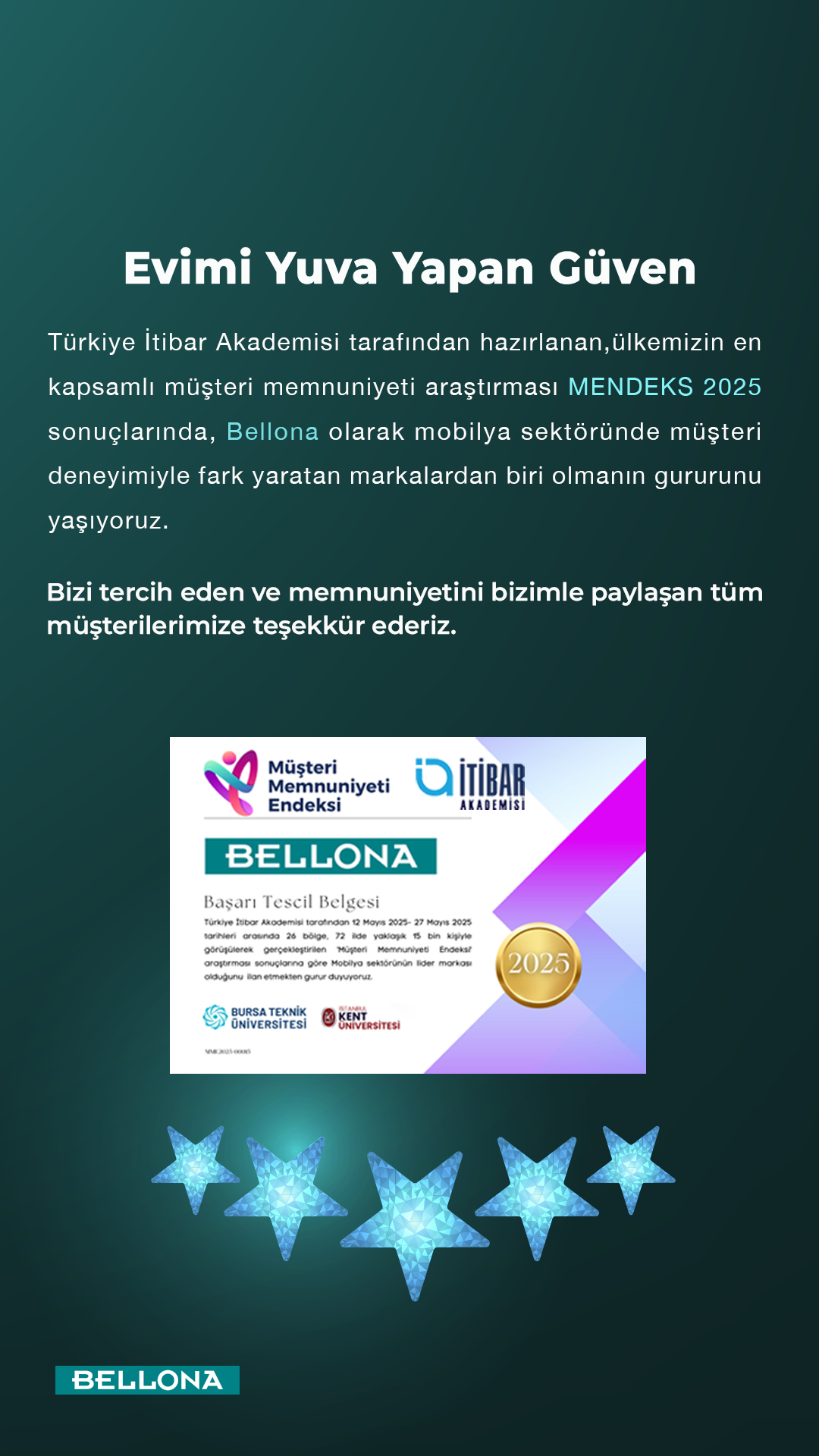 “Bellona olarak müşteri memnuniyetini her zaman önceliğimiz olarak gördük. Bu anlayışı ürün kalitemizden satış sonrası hizmetlerimize kadar tüm süreçlerimize yansıtmaya özen gösteriyoruz. Bu skor, müşterilerimizin markamıza duyduğu güvenin ve sadakatin en somut göstergesidir. Bu başarıyı sağlayan tüm çalışma arkadaşlarımıza, iş ortaklarımıza ve bizi tercih eden değerli müşterilerimize teşekkür ediyorum. Müşteri memnuniyetini temel hedefimiz olarak görmeye devam edeceğiz.”