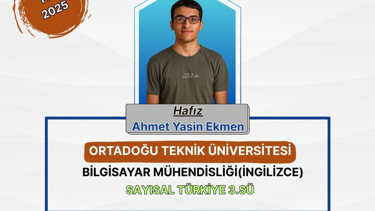 Ahmet Yasin Ekmen, sayısal alanda Türkiye 3’üncüsü olurken, açıklanan yerleştirme sonuçlarına göre Orta Doğu Teknik Üniversitesi Bilgisayar Mühendisliği (İngilizce) bölümüne yerleşti.
