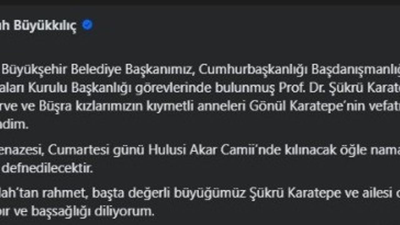 Kayseri Büyükşehir Belediye Başkanı Memduh Büyükkılıç, sosyal medya üzerinden yayımladığı başsağlığı mesajında, "Önceki Kayseri Büyükşehir Belediye Başkanımız, Cumhurbaşkanlığı Başdanışmanlığı ve Yerel Yönetim Politikaları Kurulu Başkanlığı görevlerinde bulunmuş Prof. Dr. Şükrü Karatepe’nin değerli eşi, Şeyma, Merve ve Büşra kızlarımızın kıymetli anneleri Gönül Karatepe’nin vefatını büyük bir teessürle öğrendim. Merhumenin cenazesi, Cumartesi günü Hulusi Akar Camii’nde kılınacak öğle namazına müteakip Asri Mezarlık'ta defnedilecektir. Merhumeye Allah’tan rahmet, başta değerli büyüğümüz Şükrü Karatepe ve ailesi olmak üzere tüm sevenlerine sabır ve başsağlığı diliyorum" ifadelerini kullandı.