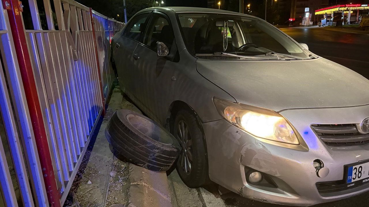 Kayseri’nin Melikgazi ilçesi Yeniköy Mahallesi Deniz Şafağı Caddesi’nde A.K. idaresindeki 38 LK 192 plakalı otomobil, sürücüsünün direksiyon hakimiyetini kaybetmesi sonucu bariyerlere çarptı. Çarpmanın etkisiyle ters dönen aracın tekerleği fırladı.