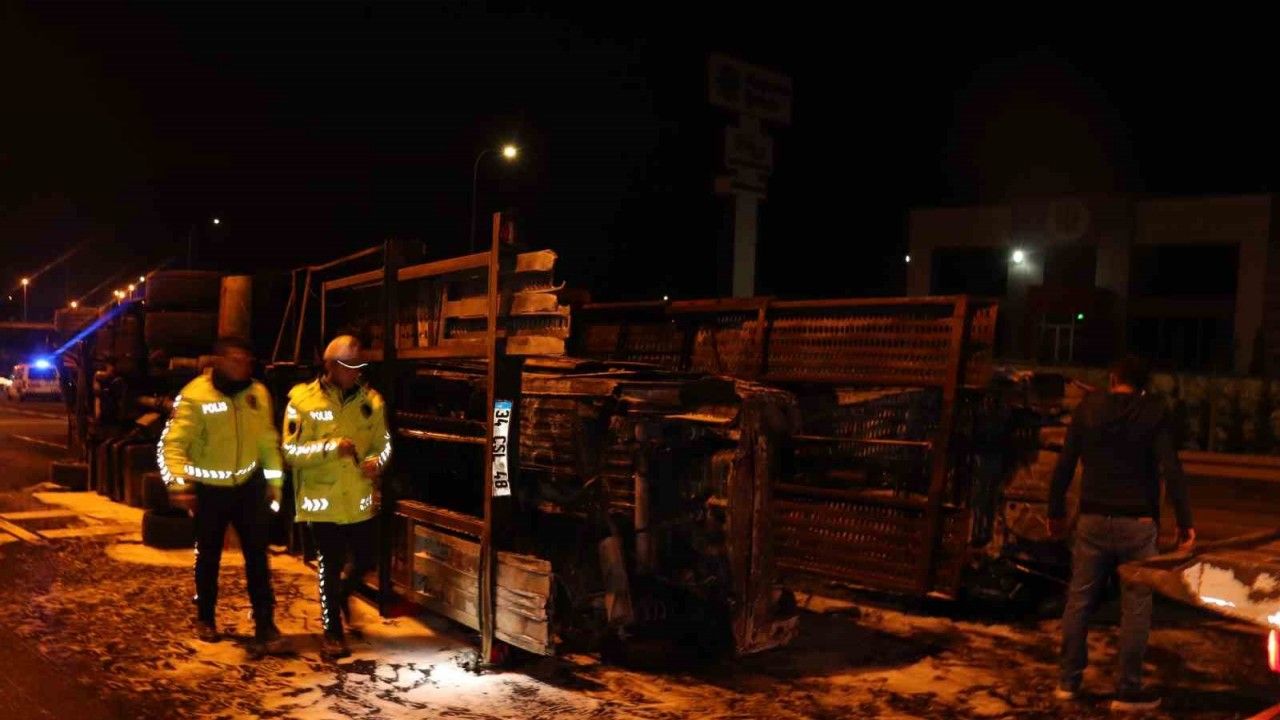 Edinilen bilgiye göre, Kayseri-Malatya karayolu Mimarsinan Mevkii’nde meydana gelen kazada, V.E. hakimiyetindeki 34 CSL 48 plakalı tır ile M.K. idaresindeki 38 JJ 068 çekici, polis uygulama noktasına kısa bir mesafede çarpıştı. Kazanın ardından yanan yatan tır alev alırken, çekici de refüjde bulunan aydınlatma direğine çarparak durabildi. Uygulama noktasındaki polis, yanan tıra müdahale ederken, sıkışan sürücüyü de camı kırarak kurtardı. İhbar üzerin bölgeye polis, itfaiye ve sağlık ekipleri sevk edildi. İtfaiye ekipleri yangına müdahale ederken, yaralı sürücülerde ilk müdahalelerinin ardından hastaneye kaldırıldı. Yolu trafiğe kapatan polis ekipleri de, kazanın meydana geldiği yerde inceleme yaptı. Tır ve üzerindeki araçlar ile çekici de incelemenin ardından kaldırıldı.