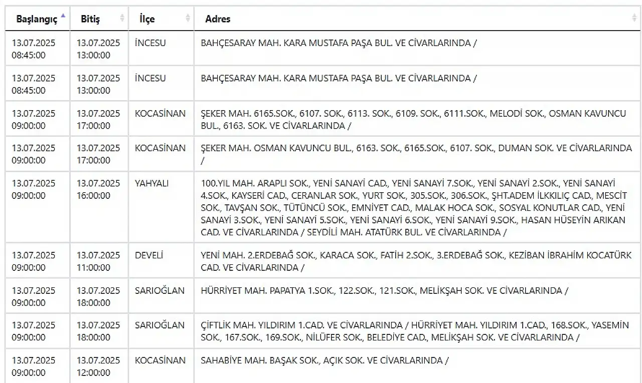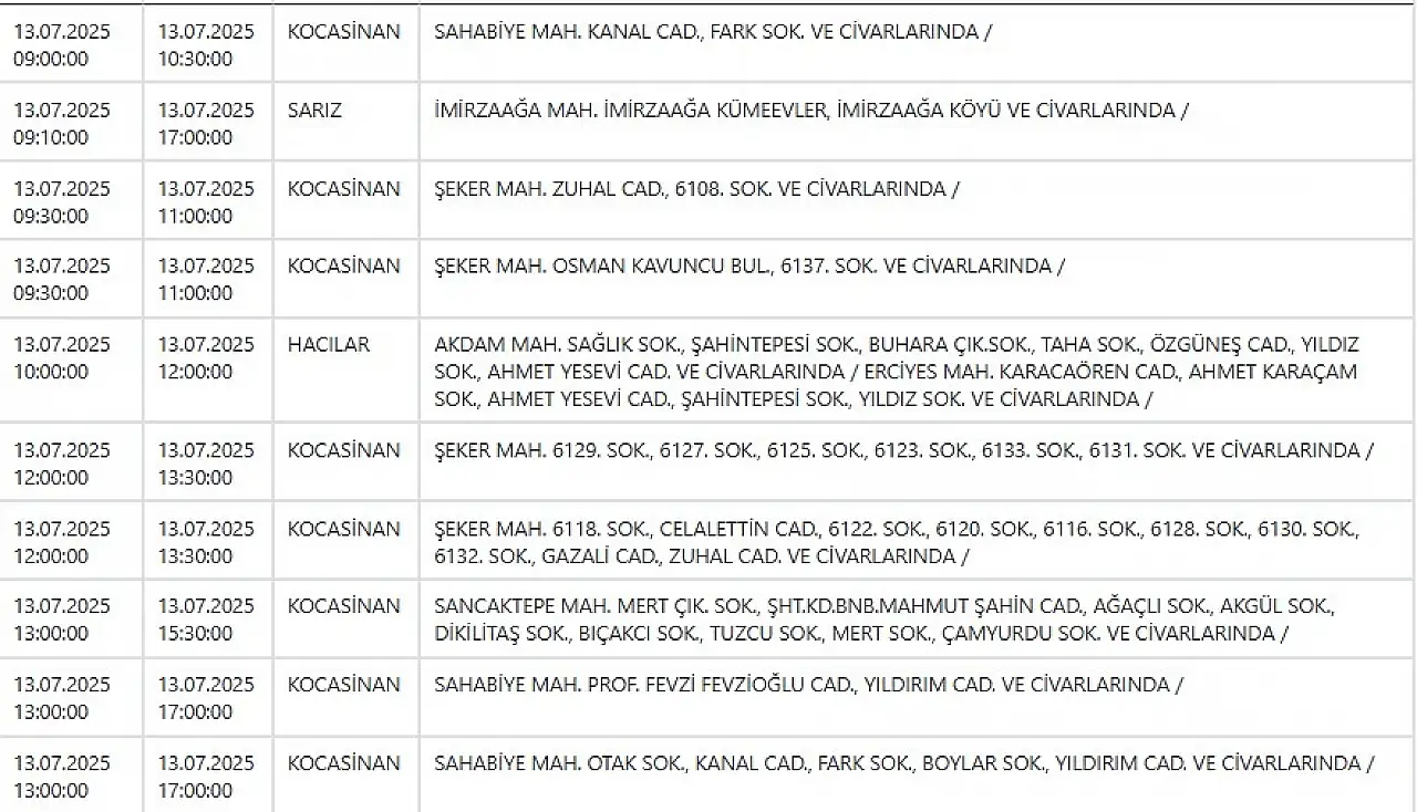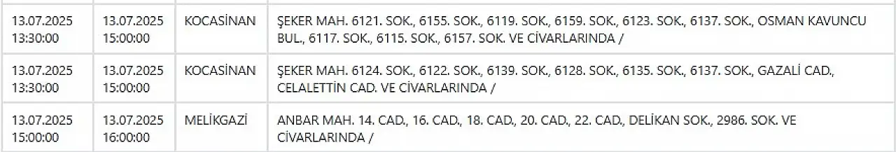 Kayseri ve Civarı Elektrik Türk Anonim Şirketi (KCETAŞ), vatandaşları uyardı. Şirketin yaptığı açıklamaya göre, 13 Temmuz 2025 Pazar günü saat 08.00’den itibaren Kayseri'nin bazı ilçelerinde bakım, onarım ve yatırım çalışmaları nedeniyle planlı elektrik kesintileri uygulanacak.