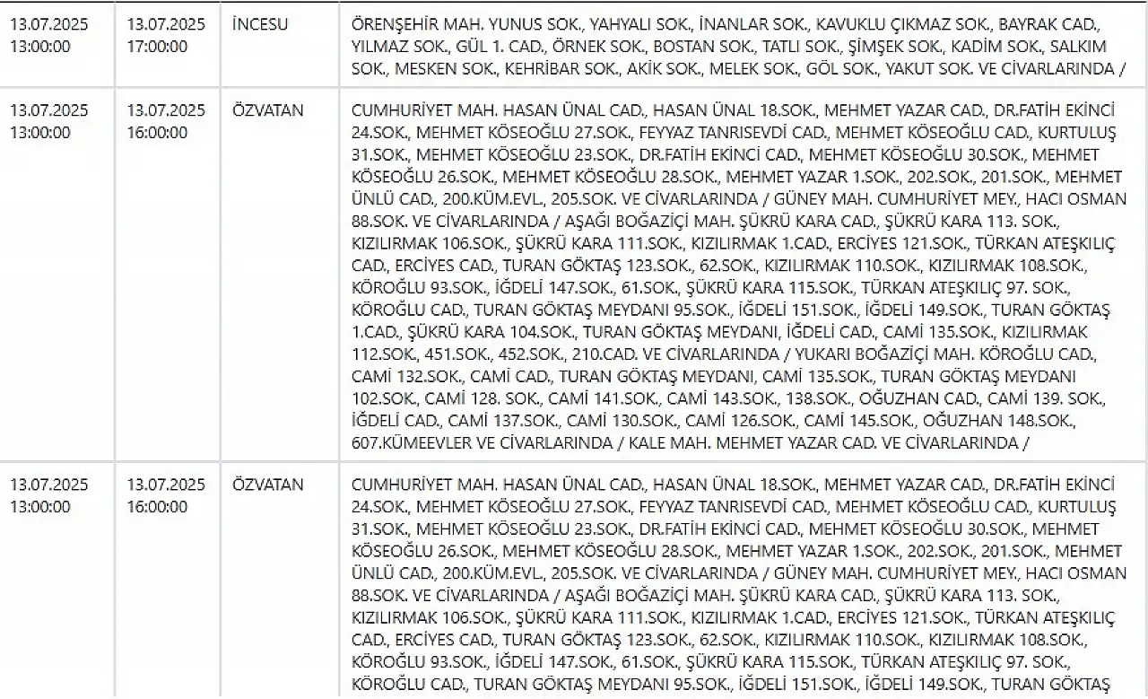 Kesintinin, ilgili bölgelerde yapılacak altyapı yenileme ve arıza giderme çalışmaları kapsamında gerçekleşeceği belirtildi. Vatandaşların mağduriyet yaşamamaları adına önceden önlem almaları tavsiye edildi.