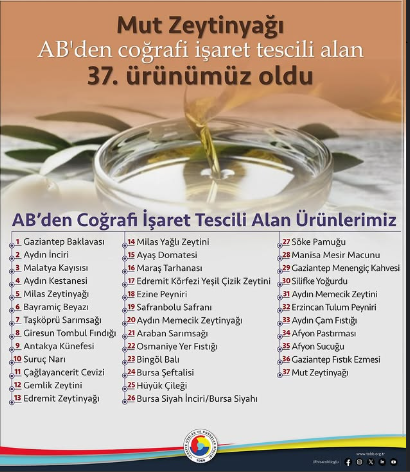 Türkiye Odalar ve Borsalar Birliği (TOBB) Başkanı Rifat Hisarcıklıoğlu, Mersin’in Mut ilçesine ait Mut Zeytinyağının Avrupa Birliği’nden coğrafi işaret tescili aldığını duyurdu. Böylece Türkiye’nin AB nezdinde tescil edilen ürün sayısı 37’ye ulaştı.