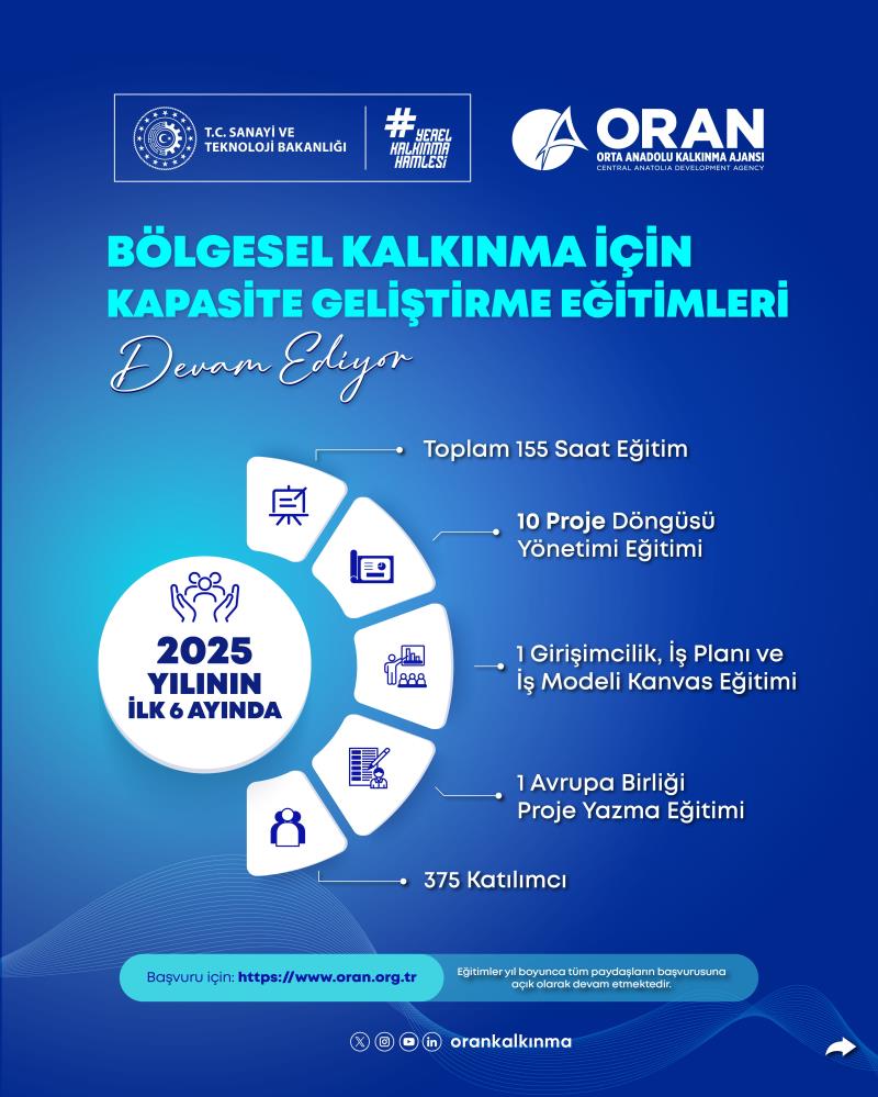 Orta Anadolu Kalkınma Ajansı (ORAN), bölgesel kalkınmayı desteklemek amacıyla 2025 yılının ilk altı ayında proje döngüsü yönetimi, girişimcilik ve Avrupa Birliği proje yazma konularında çeşitli eğitimler düzenledi. Ajans uzmanları tarafından uygulamalı olarak verilen eğitimlere toplam 375 kişi katıldı. Katılımcılar, toplamda 155 saatlik eğitim aldı.