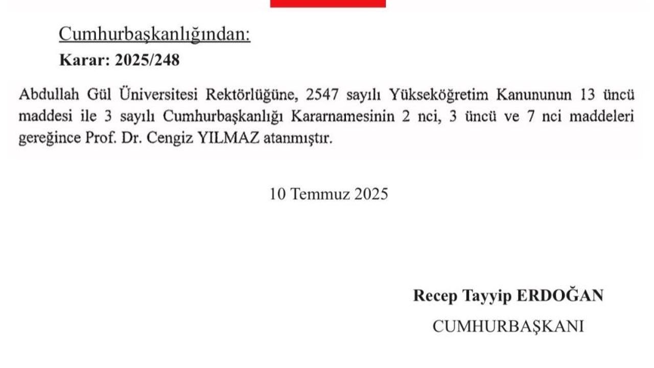 Cumhurbaşkanlığı Kararnamesi’nde, “Abdullah Gül Üniversitesi Rektörlüğüne, 2547 sayılı Yükseköğretim Kanunu’nun 13. maddesi ile 3 sayılı Cumhurbaşkanlığı Kararnamesi’nin 2., 3. ve 7. maddeleri gereğince Prof. Dr. Cengiz Yılmaz atanmıştır” ifadelerine yer verildi.